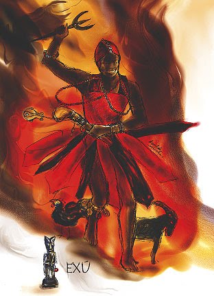 Exu (Èsù) é a figura mais controvertida do panteão africano, o mais humano dos orixás, senhor do princípio e da transformação. Deus da terra e do universo; na verdade, Exu é a ordem, aquele que se multiplica e se transforma na unidade elementar da existência humana. Exu é o ego de cada ser, o grande companheiro do homem no seu dia-a-dia. Muitas são as confusões e equívocos relacionados a Exu, o pior deles o associa à figura do diabo cristão; pintam-no como um deus voltado para a maldade, para perversidade, que se ocuparia em semear a discórdia entre os seres humanos. Na realidade, Exu contém em si todas as contradições e conflitos inerentes ao ser humano. Exu não é totalmente bom nem totalmente mau, assim como o homem: um ser capaz de amar e odiar, unir e separar, promover a paz e a guerra. O maniqueísmo, próprio das grandes religiões monoteístas, não se aplica ao Candomblé, muito menos a Exu. A cultura africana desconhece oposições, em especial a oposição entre bem e mal; sabe-se aqui que o bem de um pode perfeitamente ser o mal de outro, portanto, cada um deve dar o melhor de si para obter tudo de bom em sua vida, sempre cultuando, agradando e agradecendo a Exu, para que ele seja, no seu cotidiano, a manifestação do amor, da sorte, da riqueza e da prosperidade. Exu é o orixá que entende como ninguém o princípio da reciprocidade, e, se agradado como se deve, saberá retribuir; quando agradecido por sua retribuição, torna-se amigo e fiel escudeiro. No entanto, quando esquecido é o pior dos inimigos e volta-se contra o negligente, tirando-lhe a sorte, fechando-lhe os caminhos e trazendo catástrofes e dissabores. Exu é a figura mais importante da cultura iorubá. Sem ele o mundo não faria sentido, pois só através de Exu é que se chega aos demais orixás e ao Deus Supremo Olodumaré. Exu fala toda as línguas e permite a comunicação entre o orum e o aiê, entre os orixás e os homens. Exu é o dono do mercado, o seu guardião, por isso todo comerciante e aqueles que lidam com venda devem agradar a Exu. As vendedoras de acarajé, por exemplo, sempre oferecem o primeiro bolinho a Exu, atirando-o a rua, não só para vender bem, mas também par afastar as perturbações, evitar assaltos etc., ou seja, pra que Exu seja de fato um guardião e proteja o seu negócio. É evidente que Exu não precisa pagar no mercado, porque lá recebe muitas oferendas; nenhum comerciante deixa de agradar a Exu, A não ser os que desejam conhecer o seu lado perverso. É importante ressaltar que Exu não tem amigos nem inimigos. Exu sempre protege aqueles que o agradam e sabem retribuir os seus favores. Exu foi à primeira forma dotada de existência individual. Não se sabe ao certo sua região de origem na África, pois em todos os reinos se presta culto a Exu. Sabe-se, no entanto, que chegou a ser rei de Kêtu. Exu renasceu várias vezes e a sua história revela que é filho de Orunmilá ou de Oxum, dependendo do momento em que renasce. Notas bibliográficasCandomblé. A panela do segredo - Pai Cido de Osun Eyin - 2000